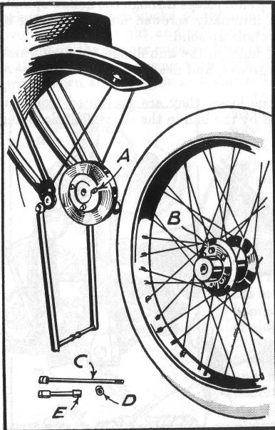 When dismantled it may be found that, in the case of the quick-detachable wheels, the dummy bearing, where it fits in the drum centre, and the latter may show signs of wear, in every case caused by the wheels being run with slack bearings. Unless the wear is very bad there is no need to replace either the dummy bearing or the centre, as all they have to do is support the brake drum complete when the wheel is removed.