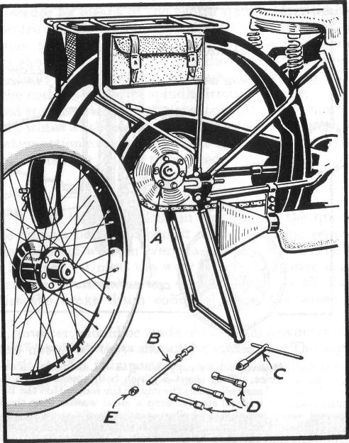 For checking the rear-wheel alignment in the frame after adjusting the chains, or if the wheel complete with brake drum has been removed, on machines from 1926 a device is fitted to the frame for carrying out the setting of the rear wheel quickly and correctly (see Fig. 22).