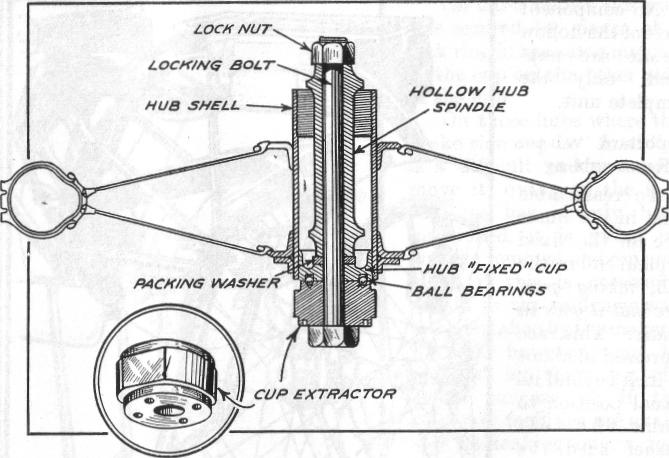 Take out the spring ring from the opposite side of the hub and remove the felt washer and holder, consisting of two plates and retaining ring (the latter being between the two plates). The hollow spindle can then be pressed or driven out from either end , bringing with it one ofthe outer races, the other can then be pressed or driven out.