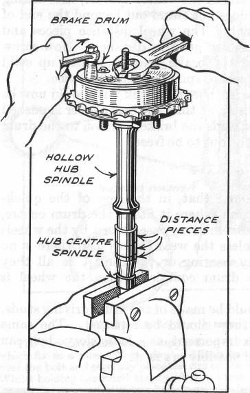If the hubs of the wheels have not been dismantled fix the brake drum to the hub and secure by means of the centre spindle, first taking care to see that the centre spindle does not stand out beyond the end of the hollow spindle more than half an inch. The wheel distance pieces and extra packing washers should be used to get this distance. Now screw the centre spindle up tight so that the brake drum is locked up solid to the hub and hold the end of the centre spindle firmly in a vice.