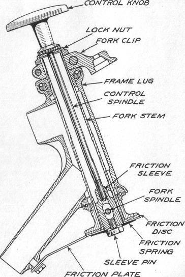 In this case (see Fig. 23) there is no need to remove the fork. First remove the pin securing the friction spring to the damper sleeve, which is inside the fork stem, next slack off a few turns the pin securing the friction plate to the frame lug and swing aside, this releasing the fabric friction disk. If it is required to dismantle completely, first unscrew the hexagon nut below the control knob which secures this to the fork stem and unscrew the control spindle right out. The nut on the end of the rear fork spindle, which passes through the fork stem lug should now be taken off and the spindle unscrewed out of the fork side plate or link, and withdraw from the lug about threequaters of its length. Do not take it right out.
