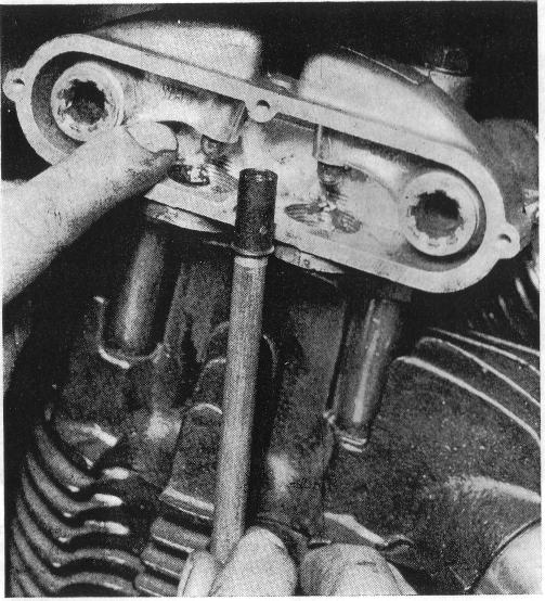 Figure 1 Shows an o.h.v. engine with the push rods removed. It will be noticed that two springs are fitted behind the cover to prevent side movement of the rockers. Whilst taking out the last pin from the rocker box, press on the cover to relieve the pressure of the springs on the latter.