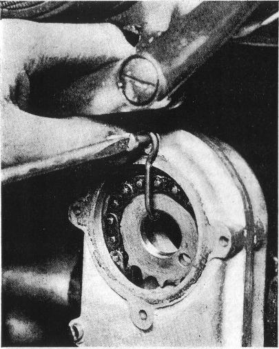 In the case of Overhead Camshaft Engines, when the cylinder or head only is removed, it is important that the camshaft sprocket and driving chain should be supported and not allowed to drop in the chain cover while the engine is being revolved. A piece of wire to prevent this happening can be hooked through the sprocket and fastened to one of the sprocket cap pins screwed into the top of the chain cover (fig. 5)