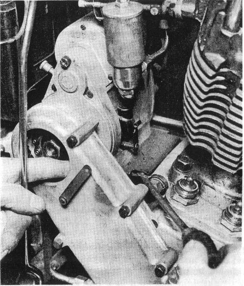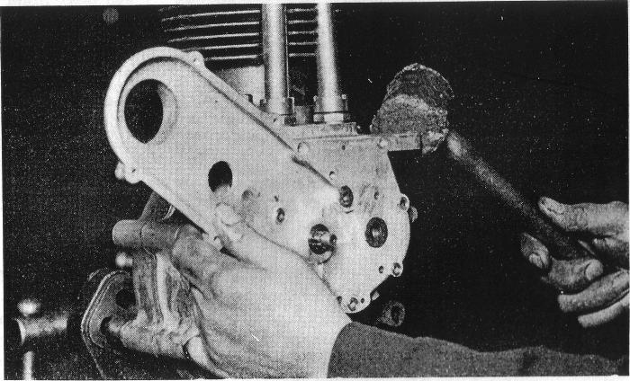 Fig 7 - Removing the timing cover - tap lightly at the back or top with a mallet, at the same time pulling the cover away and keeping it square with the crankcase.