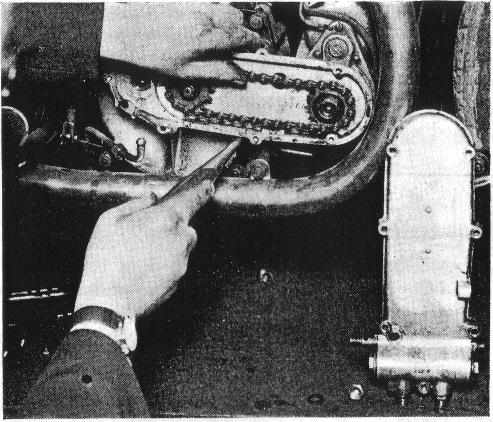 After the nuts on side of the platform have been slacked off, lever the latter up from the front. Note the chain inspection hole