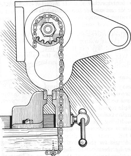 This arrangement holds the spocket fast while the lock nut is unscrewed. To tighten up the lock nut, the chain is reversed on the sprocket.